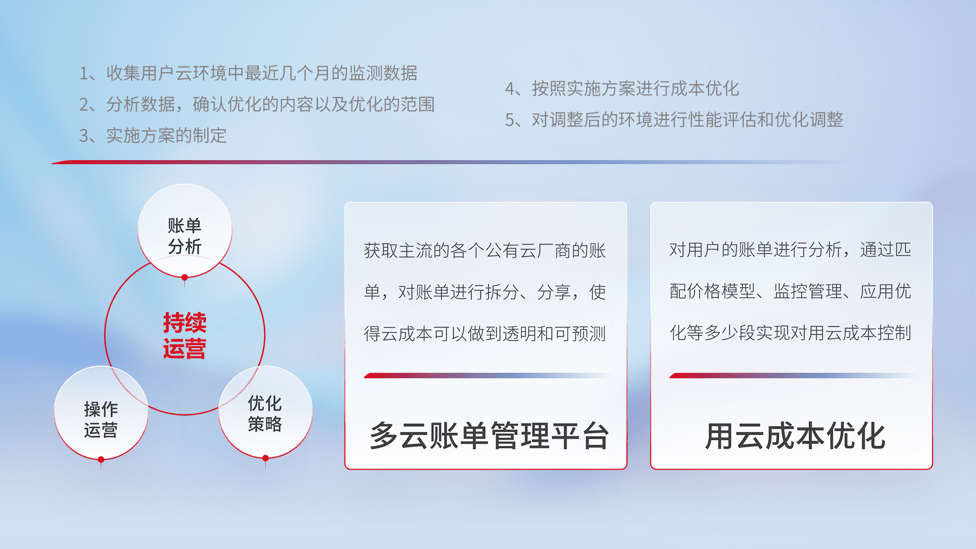 通过多云纳管,,,,以统一的资源数据模型把客户的云资源进行抽象和封装,,,进而实现对多云资源的统一操作,,,保障云资源管理的可靠性、、、、稳定性与可用性。。。。量身定制化运维内容,,,配置、、、开发运维、、补丁管理、、、、备份、、监控、、、、认证和访问管理、、、、审计和日常巡检等,,保障在用云过程中的可靠度,,稳定度以及高可用率。。。。